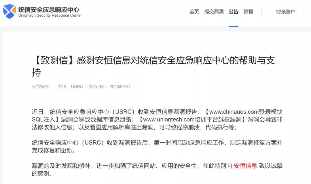 在安全研究方面,安恒信息積極與統信軟件開展安全研究工作,包括系統代碼安全、應用商店安全監測、操作系統安全中心共建、SRC應用響應中心、內生安全接口安全共建等。此前,安恒信息以過硬的技術向統信安全應急響應中心提交潛在漏洞,共同助力安全生態建設,保障用戶的隱私和財產安全,收到了來自統信安全應急響應中心發布的感謝信。