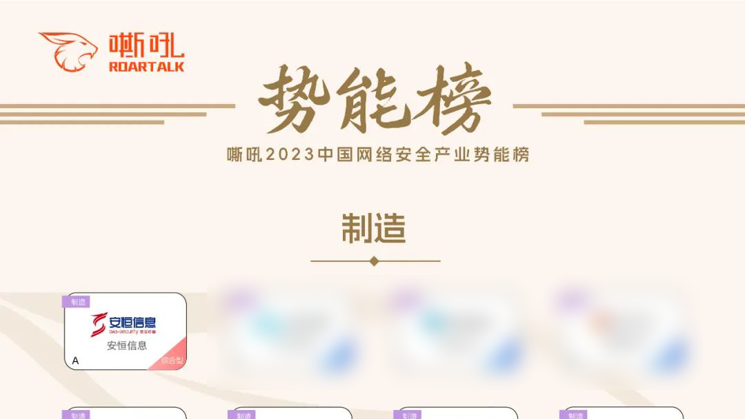 嘶吼安全產(chǎn)業(yè)研究院開展了《2023中國網(wǎng)絡(luò)安全產(chǎn)業(yè)勢能榜》的評(píng)選,旨在深入研判和展望中國網(wǎng)絡(luò)安全產(chǎn)業(yè)的發(fā)展趨勢,賦能網(wǎng)安領(lǐng)域頭部廠商擔(dān)負(fù)起自主創(chuàng)新、乘勢而上的產(chǎn)業(yè)責(zé)任。安恒信息成功入選“政府”與“制造”兩大榜單。這一榮譽(yù)是對(duì)安恒信息在這兩大行業(yè)中數(shù)字安全領(lǐng)域的領(lǐng)先地位和卓越能力的肯定。作為行業(yè)的領(lǐng)軍企業(yè)之一,安恒信息一直致力于為用戶提供一站式綜合服務(wù)和解決方案,并針對(duì)不斷變化的數(shù)字安全威脅和用戶需求持續(xù)進(jìn)行技術(shù)研發(fā)和創(chuàng)新。