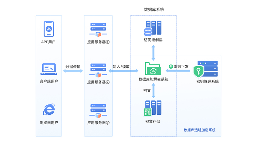 數據庫透明加密系統,基于國產密碼算法,為用戶提供安全合規、易部署的透明存儲加密服務。產品支持在不更改原有數據庫系統架構的情況下實現數據的透明加密,有效防止數據庫存儲環節可能出現的泄露風險。