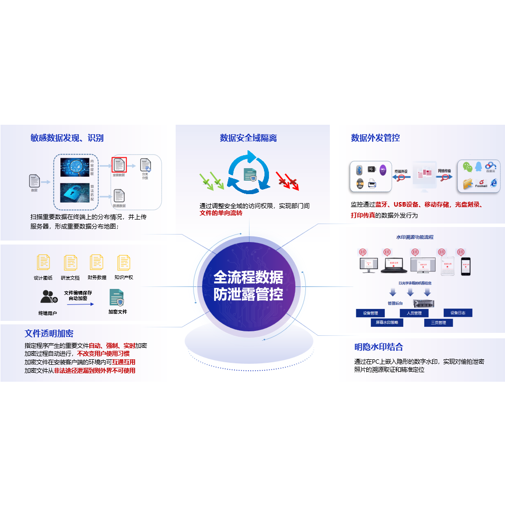 以數據安全技術為核心,具備內容識別技術、邊界防護技術、動態防護技術為核心,對終端用戶的各種操作行為進行監控,結合先進的指紋匹配技術、自然語義分析、機器學習等智能算法,準確識別出終端上的敏感數據、重要數據及數據安全風險行為,并根據策略進行相應的管控,從根本上為用戶解決數據泄漏難題。